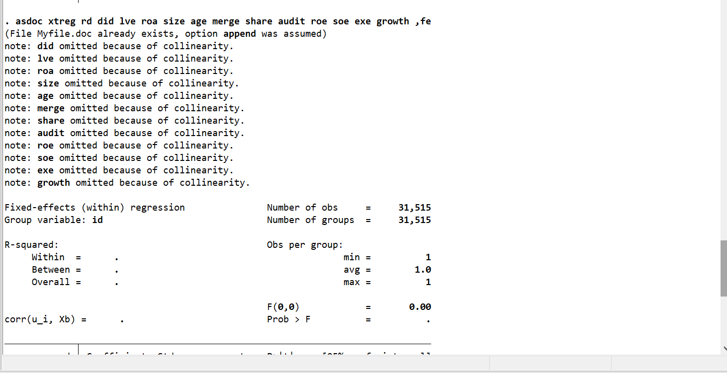 渐进did,在进行f检验时,除因变量外,其他变量(自变量和控制变量)都被omit(通过了多重共线性分析)。之前在进行xtreg y x i.year,fe时也是这样。请问是什么原因呢,求助