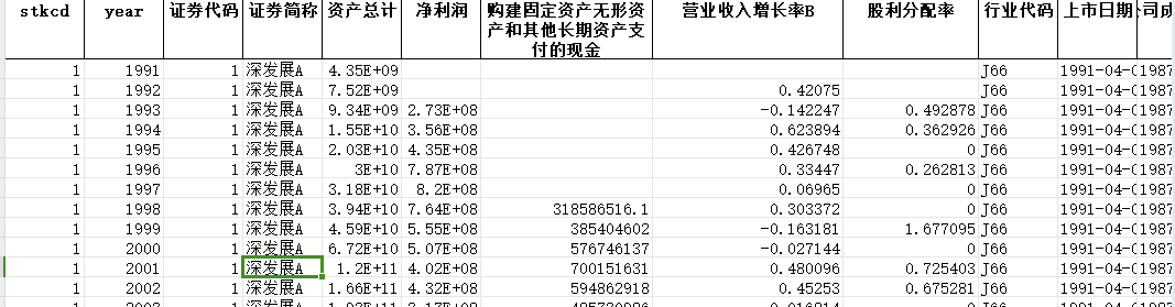 共计15个指标:stkcd、year、证券代码、证券简称、资产总计、净利润、购建固定资产无形资产和其他长期资产支付的现金、营业收入增长率B、股利分配率、行业代码、上市日期、公司成立日期、退市日期、总得分、企业生命周期