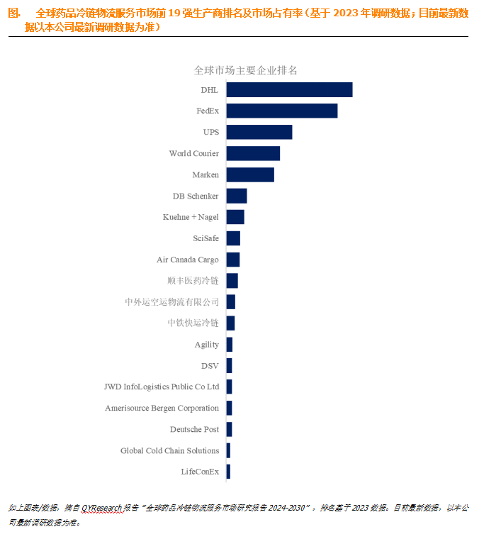 根据QYResearch头部企业研究中心调研,全球范围内药品冷链物流服务生产商主要包括DHL、FedEx、UPS、World Courier、Marken、DB Schenker、Kuehne + Nagel、SciSafe、Air Canada Cargo、顺丰医药冷链等。2023年,全球前五大厂商占有大约21.8%的市场份额。