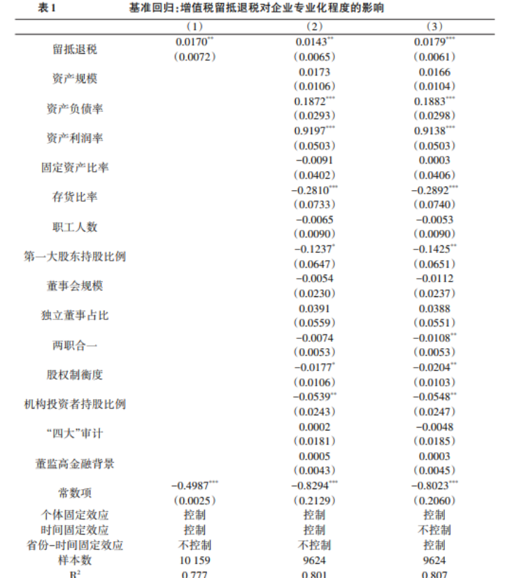 ▪ 主要内容:深化企业专业化分工是塑造现代产业链供应链关系的基础,增值税税收中性的实现有助于促进企业专业化分工。本文借助2018年增值税留抵退税改革的“准自然实验”,基于上市企业集团母公司财务信息,使用双重差分法考察增值税税收中性对企业专业化的影响。本文发现,增值税留抵退税推动企业分离后向业务,使企业专业化程度提高。该政策的作用机制在于改善企业资金状况、减少增值税留抵给企业带来的制度性交易成本,从而促使企业增进与外部市场的交易往来。异质性分析显示,当企业的增值税进销项税率差异较大、融资约束较强、所在地区营商环境较好时,增值税留抵退税对专业化的促进作用更明显。