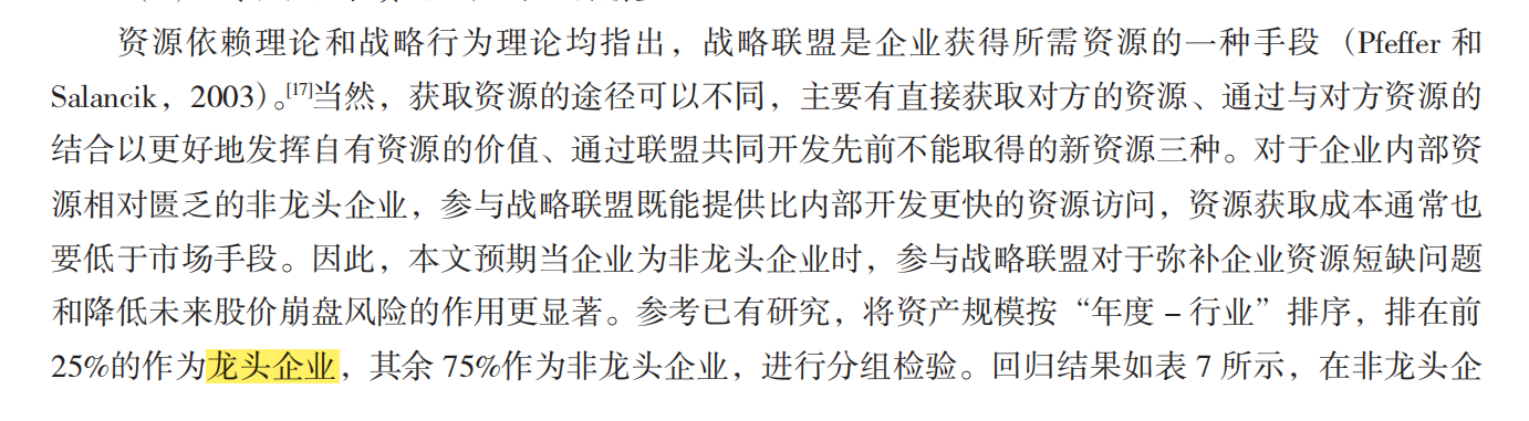 【是否龙头企业】如果企业属于龙头企业则为1,否则为0。将企业资产规模(企业的总资产)按年度-行业排序,在前25%作为龙头企业,其余75%作为非龙头企业