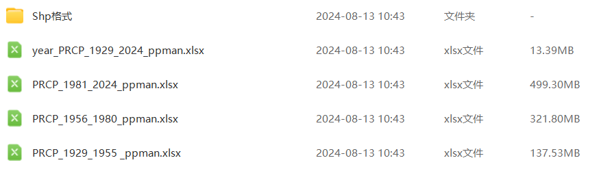 其中PRCP_1929_1955等三个表格为日降水数据,因其数据量过大将其分别放在三个表格之中,year_PRCP_1929_2024为年平均降水数据。