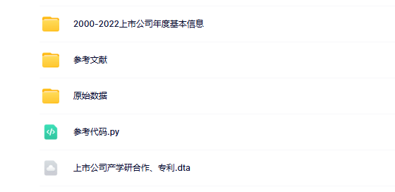 2000-2022上市公司年度基本信息.dta;参考文献_产学研合作对企业创新质量的影响研究_刘斐然.pdf;参考文献_产学研合作如何影响企业的市场绩效__刘斐然.pdf;上市公司-专利明细数据简化版.csv;参考代码.py;上市公司产学研合作、专利.dta