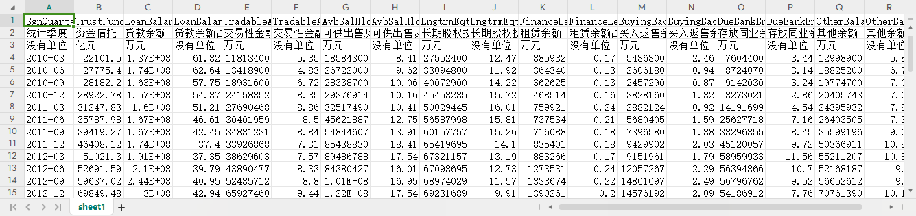 统计季度 资金信托 贷款余额 贷款余额占比(%) 交易性金融资产投资余额 交易性金融资产投资余额占比(%) 可供出售及持有至到期投资余额 可供出售及持有至到期投资余额占比(%) 长期股权投资余额 长期股权投资余额占比(%) 租赁余额 租赁余额占比(%) 买入返售余额 买入返售余额占比(%) 存放同业余额 存放同业余额占比(%) 其他余额 其他余额占比(%)