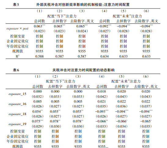 4.机制检验:注意力时间配置。表5和表6分别从静态和动态对企业家注意力时间配置的机制进行检验。其中,两表的(1)-(3)列是对配置“当下”注意力回归的结果,(4)-(6)列是对配置“未来”注意力回归的结果。表5中(1)-(3)列使用MD&A章节中配置“当下”的词频数量作为被解释变量,无论采用何种标准化方式,关税冲击程度均对企业家配置“当下”注意力存在正向显著影响。(4)-(6)列使用MD&A章节中配置“未来”的词频数量作为被解释变量,无论采用何种标准化方式,关税冲击程度均对企业家配置“未来”注意力产生了负向显著影响。