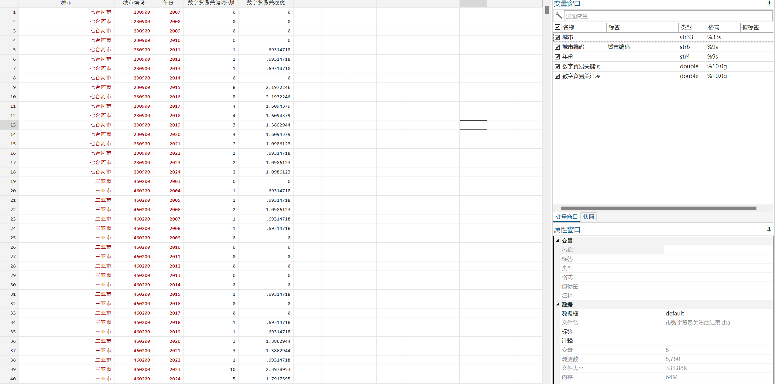 【更新至2024】数字贸易关注度词频统计2024-2003年市级文本分析数据Stata含说明