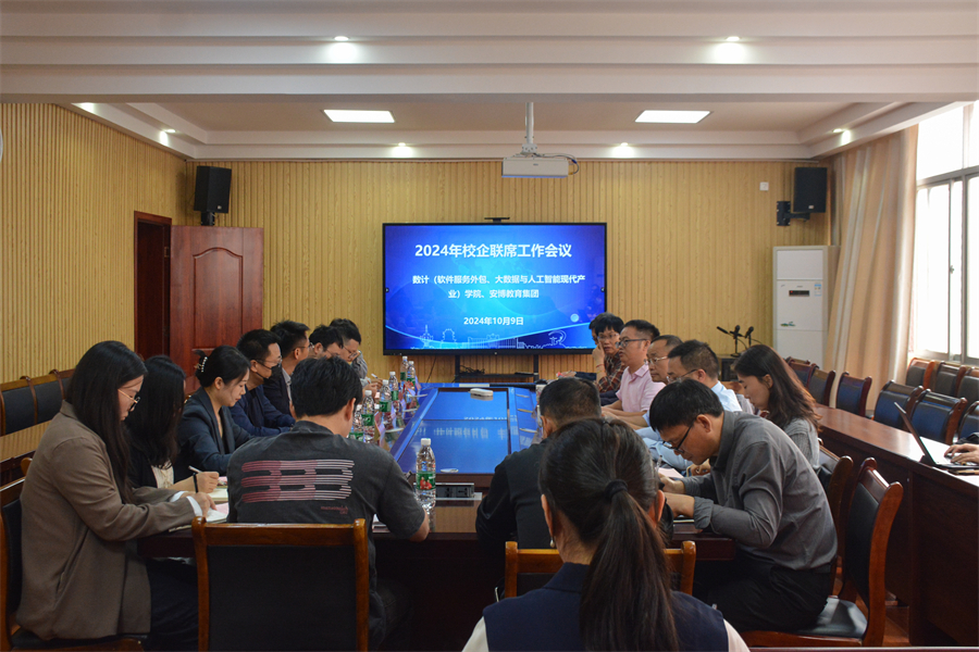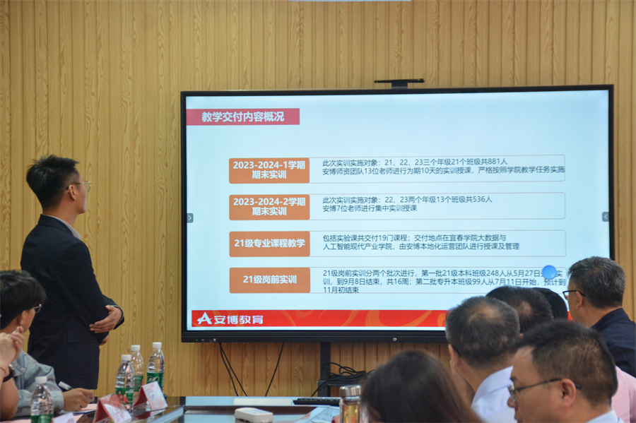 近日,安博与宜春学院数计学院共同举办的“2024年校企联席工作会议”顺利召开。安博教育科技集团旗下北京安博大成教育科技有限责任公司联席总经理孙国瑜、安博教育科技集团大学事业部江西分公司总经理喻军、宜春学院服务外包工作小组成员、安博驻校教学与管理团队人员参加本次大会。