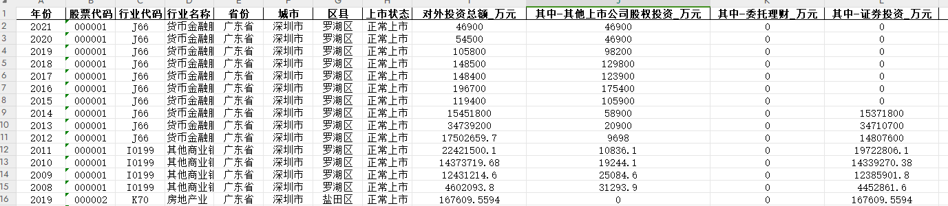 本期数据涵盖了2008年至2022年间上市公司的对外投资情况。数据包括各公司的对外投资总额以及股权投资、证券投资等详细信息。通过分析这些数据,可以了解上市公司在过去几年里对外投资的规模、领域以及投资策略的变化,从而揭示出公司的扩张战略和市场趋势。