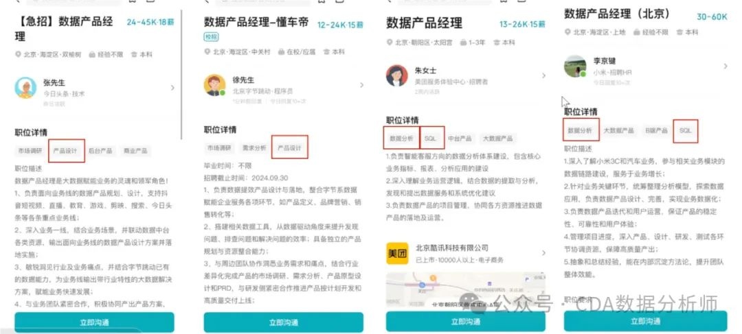 我查看了Boss直聘上今日头条、美团和小米等公司近期发布的数据产品经理职位详情,从中可以对数据产品经理有个初步了解。