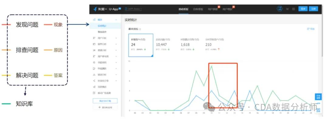 数据产品是一种帮助企业改进决策的服务或应用程序,可能是一个APP或外部应用,主要目标是利用数据处理帮助管理人员执行决策。上面截图就是一个典型的数据产品,可以监控APP的新增用户、启动次数等,进行实时统计。