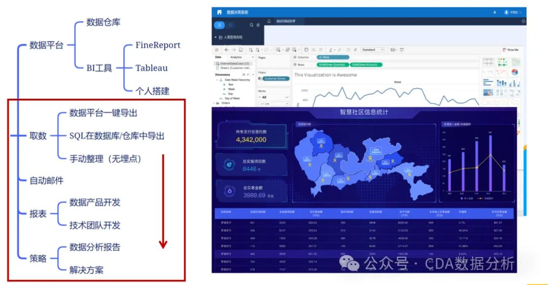 BI工具的使用,如Tableau和Power BI,也是数据产品经理需要掌握的。这些工具可以帮助我们开发报表,提升需求方的工作效率,让他们更清晰地看到自己的工作量。此外,企业也会搭建自己的dashboard,这通常更灵活,不受第三方模板限制,也不需要额外成本,通常由技术人员搭建。