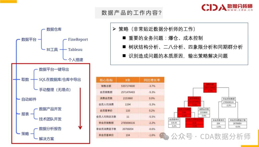 更侧重于业务增长服务。此外,还需负责数据产品的迭代和用户运营,管理项目进度,协调产品设计、研发、测试等环节,确保数据产品高质量产出。