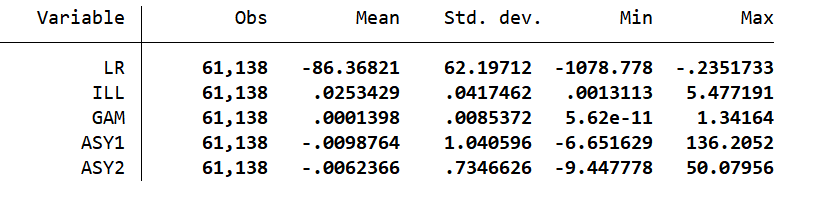 我们利用中国上市公司股票交易的微观结构数据(按流通市值加权的市场收益率rm、公司个股日收益率r、日成交量V和年度交易天数D)构建LR、ILL和GAM指标。但正如Hasbrouck(2007)所指出的,上述每个指标既包含与非对称信息相关的成分,也可能包含与非对称信息无关的成分,不能全面刻画信息不对称的全部特征。为此,我们遵循Bharath et al.(2009)的做法,对原始指标提取第一主成分,捕捉它们的共同变异信息也即与非对称信息相关的成分,记为信息不对称指标ASY。