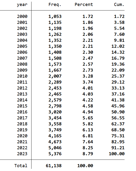 年份:2000-2023 范 围:A股上市公司 三个版本: 信息不对称水平ASY(未剔除未缩尾)、 信息不对称水平ASY(已剔除金融STPT未缩尾)、分信息不对称水平ASY(已剔除金融STPT已缩尾) 文件格式:Dta格式(使用Stata打开)、Xlsx格式(使用Excel打开) 注:提供了剔除所需数据和剔除代码,若无需做该项剔除处理,自行删除相关代码重新运行即可 行业参照证监会2012年行业分类标准,制造业用二级行业分类,其他用一级分类来计算并对连续型变量进行了1%和99%分位数的缩尾处理 代码格式:do文件(Stata 14/15/16/17/18)