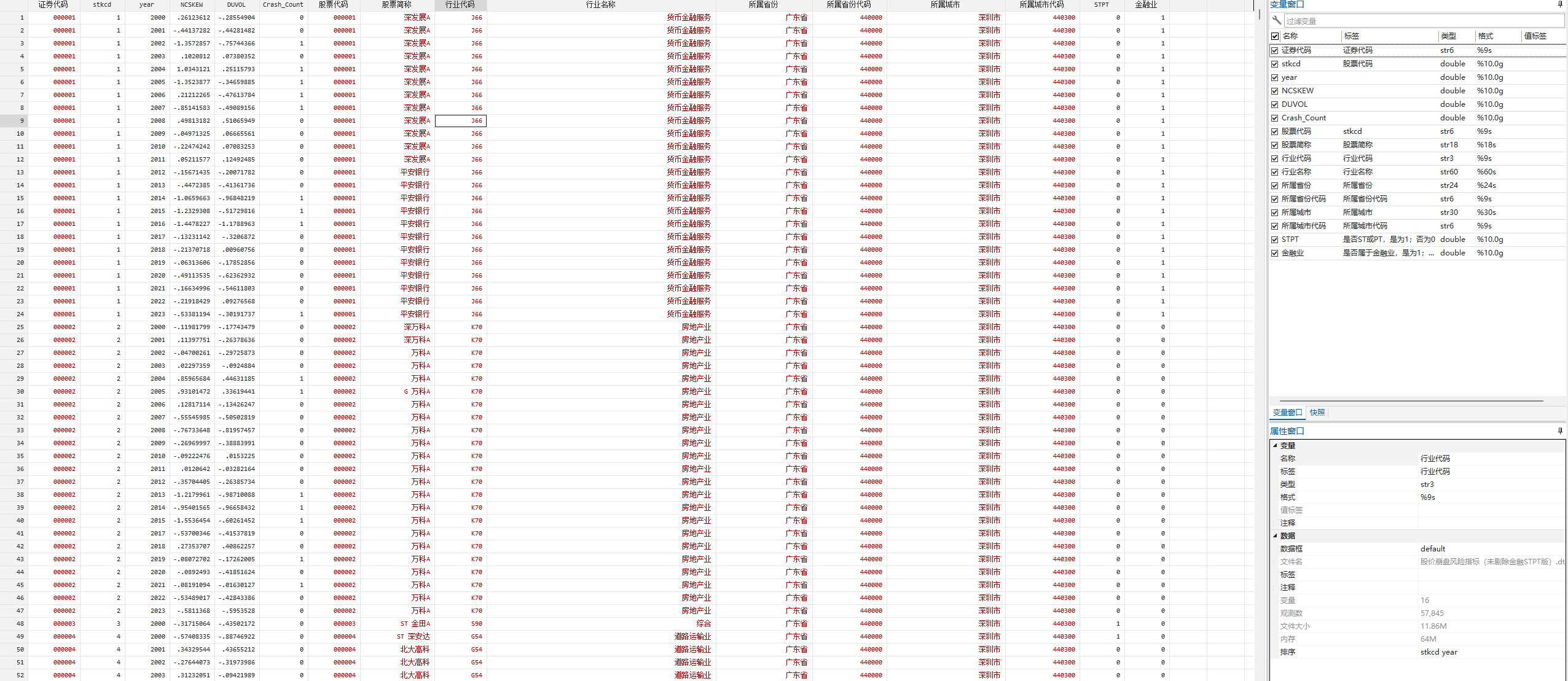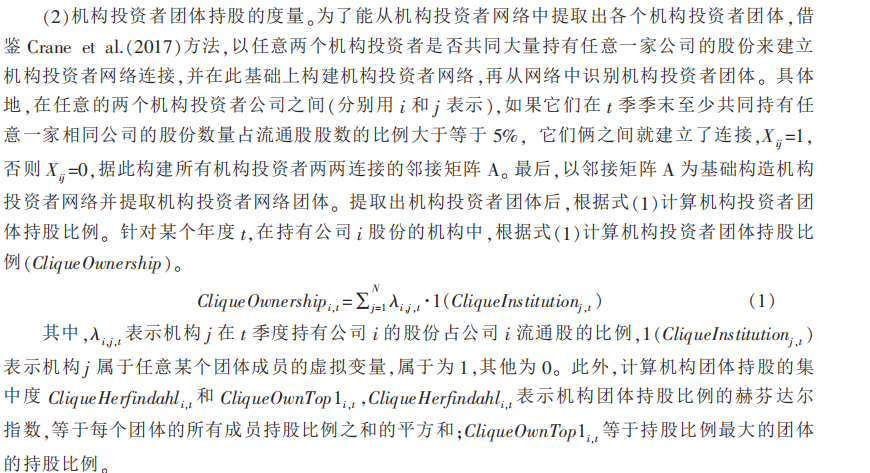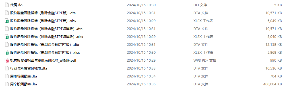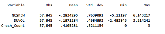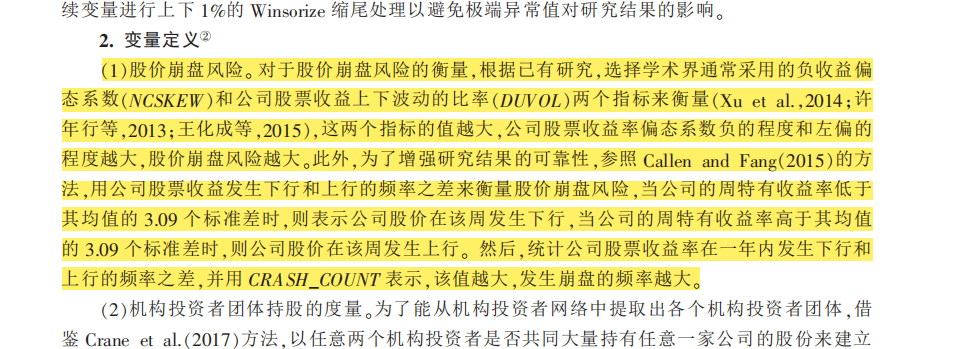 其中,n为股票i在某季度的交易天数。NCSKEW的值越大,意味着负收益偏态系数越大,股价崩盘风险越高。 二是采用收益率上下波动比率(DUVOL)度量股价崩盘风险。 对于每个公司、季度,首先定义特质收益率小于均值的日为下跌日,特质收益率高于均值的日为上涨日。然后分别计算出下跌日和上涨日特质收益率的标准差,得出下跌波动率和上涨波动率。 最后,以下跌波动率除以上涨波动率并取自然对数,即得到每一个公司、季度样本的 DUVOL 指标。 计算公式如下: