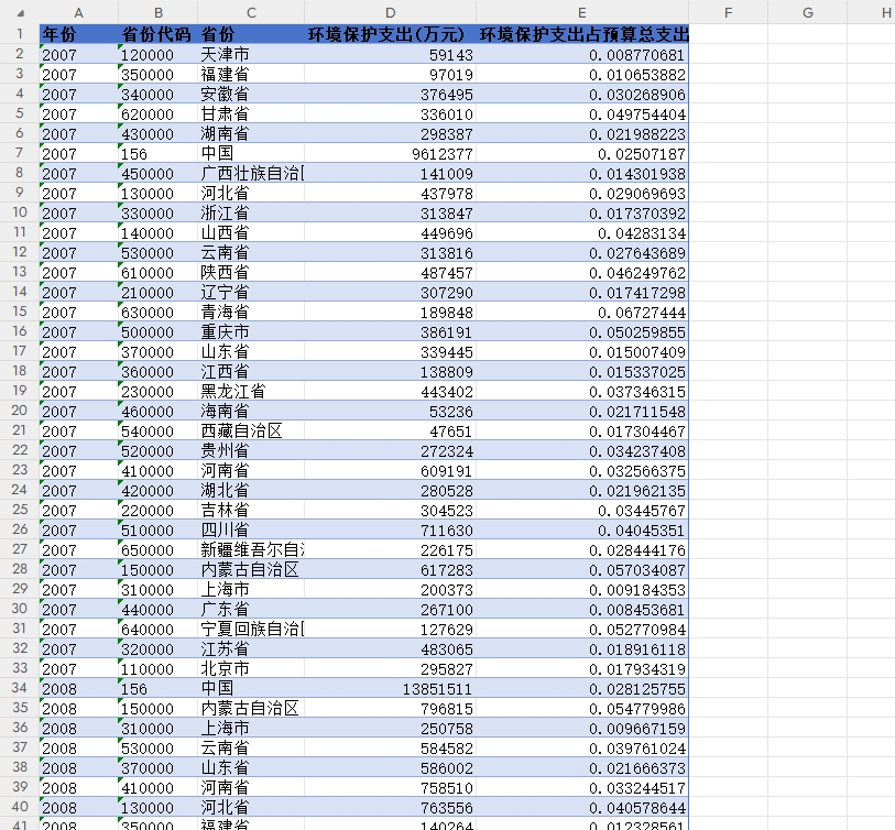 | 年份 | 省份代码 | 省份 | 环境保护支出(万元) | 环境保护支出占预算总支出 |