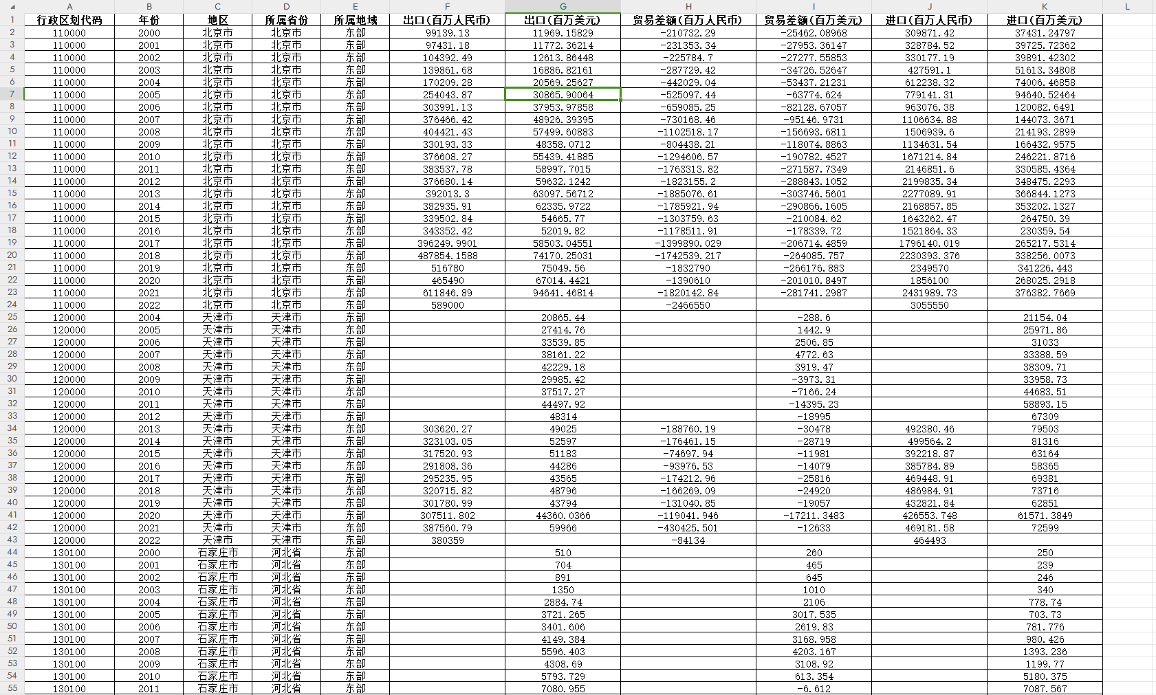 全国290多个地级市进口额出口额进出口贸易差额数据2000-2023