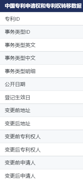 CnOpenData中国专利申请权和专利权转移数据整理了专利申请权、专利权的转让情况,包含专利ID、事务类型、公开日期、登记生效日、变更前专利权人、变更后专利权人、变更前申请人、变更后申请人等字段,以期为相关创新研究助力。