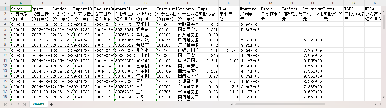 证券代码 报告日期 预测终止日 研究报告ID 发布日期 分析师ID 分析师姓名 证券公司ID 证券公司名称 每股收益 市盈率 净利润 息税前利润 扣除息、税、折旧及摊销前利润 主营业务收入 每股经营现金流 每股净资产 总资产收益率 净资产收益率 市净率 总资产周转率 归属于母公司所有者的净利润 利润总额 营业利润 资产总额 负债总额