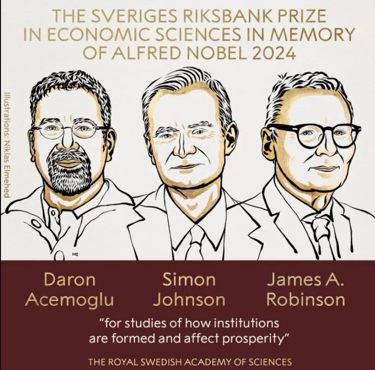 2024年诺贝尔经济学奖授予了达龙·阿西莫格鲁(Daron Acemoglu)、西蒙·约翰逊(Simon Johnson)和詹姆斯·A·罗宾逊(James A. Robinson),以表彰他们在理解制度如何影响经济发展方面的贡献。(“for studies of how institutions are formed and affect prosperity”)