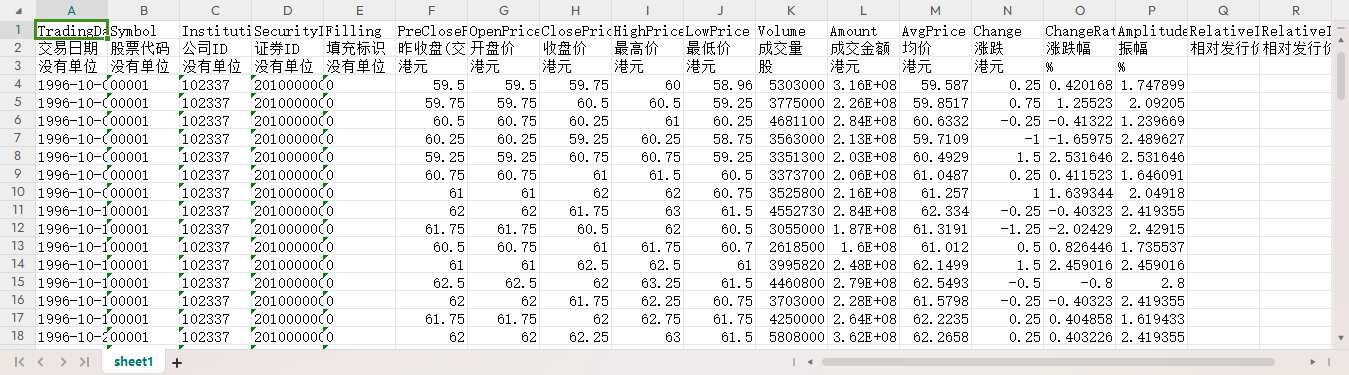 交易日期 股票代码 公司ID 证券ID 填充标识 昨收盘(交易所) 开盘价 收盘价 最高价 最低价 成交量 成交金额 均价 涨跌 涨跌幅 振幅 相对发行价涨跌 相对发行价涨跌幅