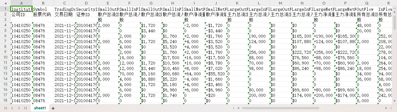 公司ID 股票代码 交易日期 证券ID 散户总流出量 散户总流入量 散户总流出额 散户总流入额 散户净流量 散户净流额 主力总流出量 主力总流入量 主力总流出额 主力总流入额 主力净流量 主力净流额 所有总流出量 所有总流入量 所有总流出额 所有总流入额 所有净流量 所有净流额 行业散户总流出额 行业散户总流入额 行业主力总流出额 行业主力总流入额 行业总流出额 行业总流入额 行业散户净流额 行业主力净流额 行业净流额