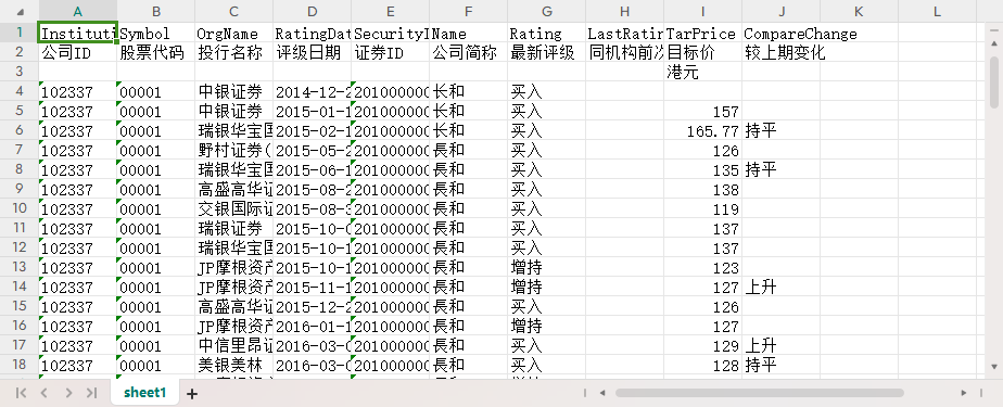 公司ID 股票代码 投行名称 评级日期 证券ID 公司简称 最新评级 同机构前次评级 目标价 较上期变化