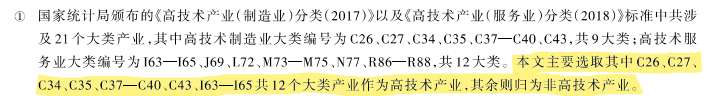 国家统计局颁布的《高技术产业(制造业)分类(2017)》以及《高技术产业(服务业)分类(2018)》标准中共涉及21个大类产业,其中高技术制造业大类编号为C26、C27、C34、C35、C37一C40、C43,共9大类;高技术服务业大类编号为I63一I65、J69、L72、M73一M75、N77、R86一R88,共12大类。本文主要选取其中C26、C27、C34、C35、C37一C40、C43、I63一I65共12个大类产业作为高技术产业,其余则归为非高技术产业。