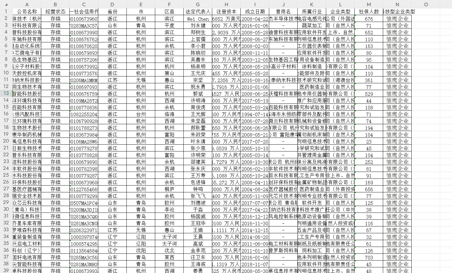 指标包括:企业名称、法人、成立时间、注册资本、经营状态、注册地址、所属行业、所属省、所属市、称号、企业性质、上市情况、级别、发布日期、获评年份、所属批次、有效期起、有效期止、发文机关