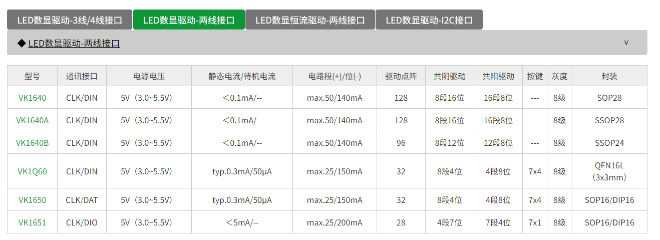 VK1640A   3.0~5.5V   驱动点阵:128   共阴驱动:8段16位   共阳驱动:16段8位      通讯接口:CLK/DIN