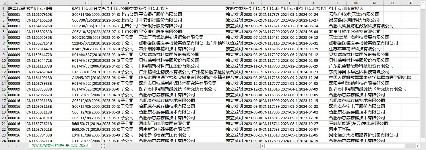 上市公司发明专利被引用明细1991-2023发明申请授权专利的被引用数量被引用专利号所有权人