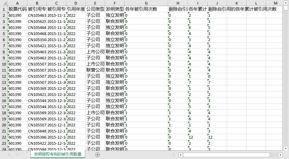 各年累计被引用次数[各年累计被引用次数]-专利在相应年份以前(包括当年)累计被引用的次数,单位:次