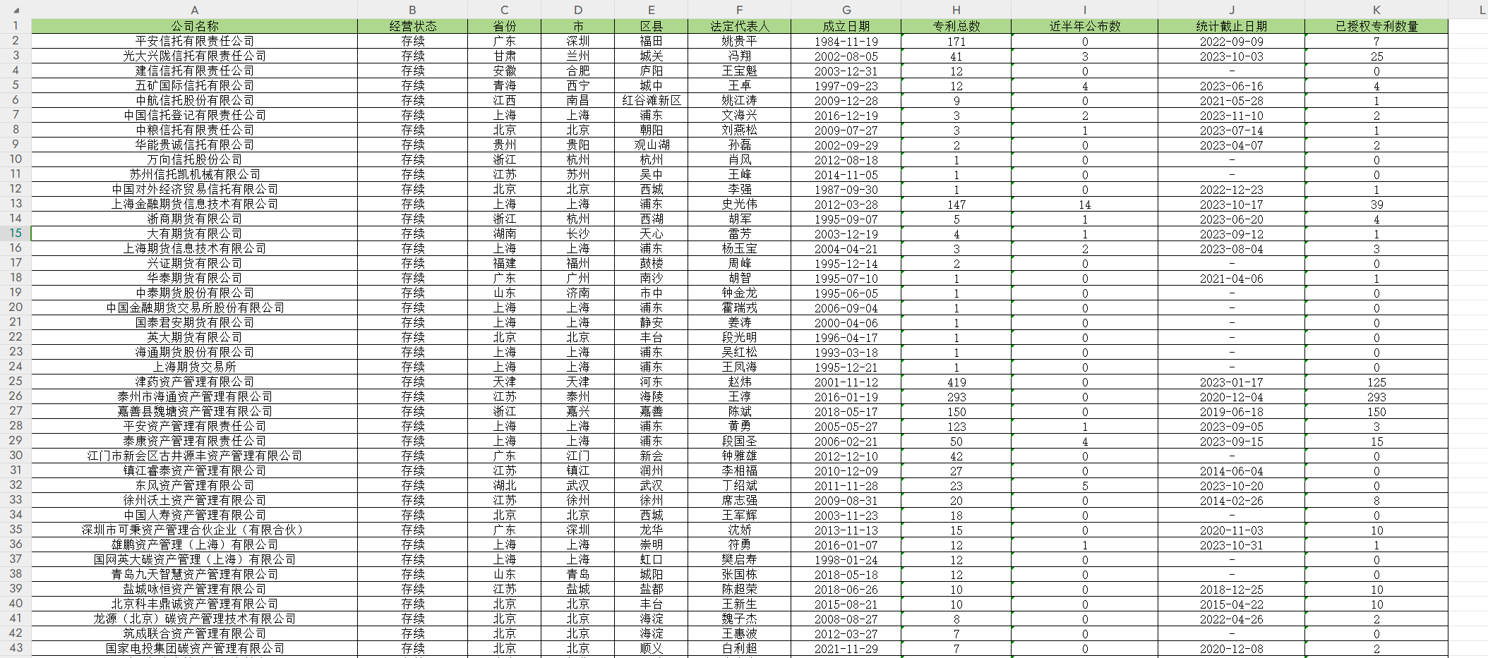 公司名称、经营状态、省份、市、区县、法定代表人、成立日期、专利总数、近半年公布数、统计截止日期、已授权专利数量