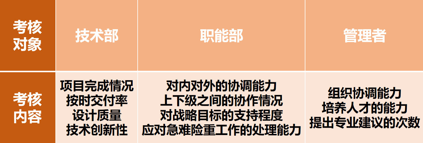 针对技术部门员工,考核聚焦项目完成情况、按时交付率、设计质量以及技术创新性,确保高效高质完成任务。对于职能部门而言,将重点考核对内对外的协调能力、上下级之间的协作情况、对战略目标的支持程度以及应对急难险重工作的处理能力等,以提升运营效率。