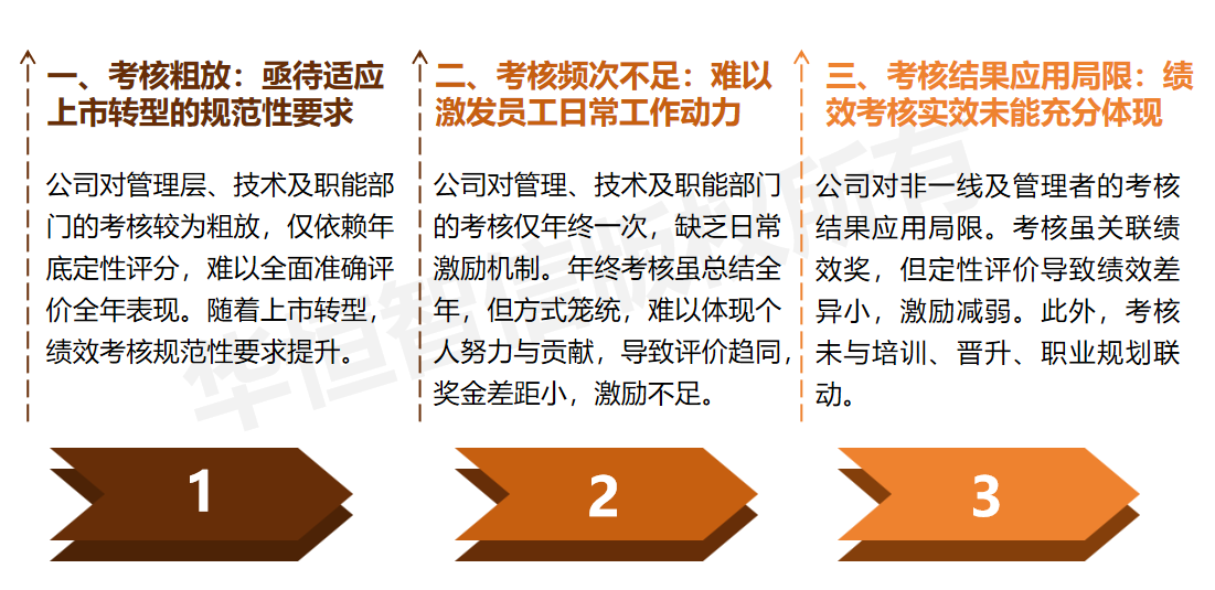 公司对管理层、技术及职能部门的考核较为粗放,仅依赖年底定性评分,难以全面准确评价全年表现。随着上市转型,绩效考核规范性要求提升。现有体系难以满足上市需求,故需改进优化,以确保考核公正、客观、准确,助力上市转型。