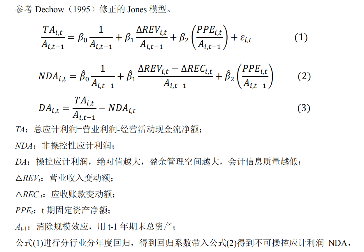 2. **应计盈余管理指标表-修正Jones模型(2000-2023年)**:基于修正后的Jones模型计算,以评估公司是否利用会计估计和政策选择来操纵利润。
