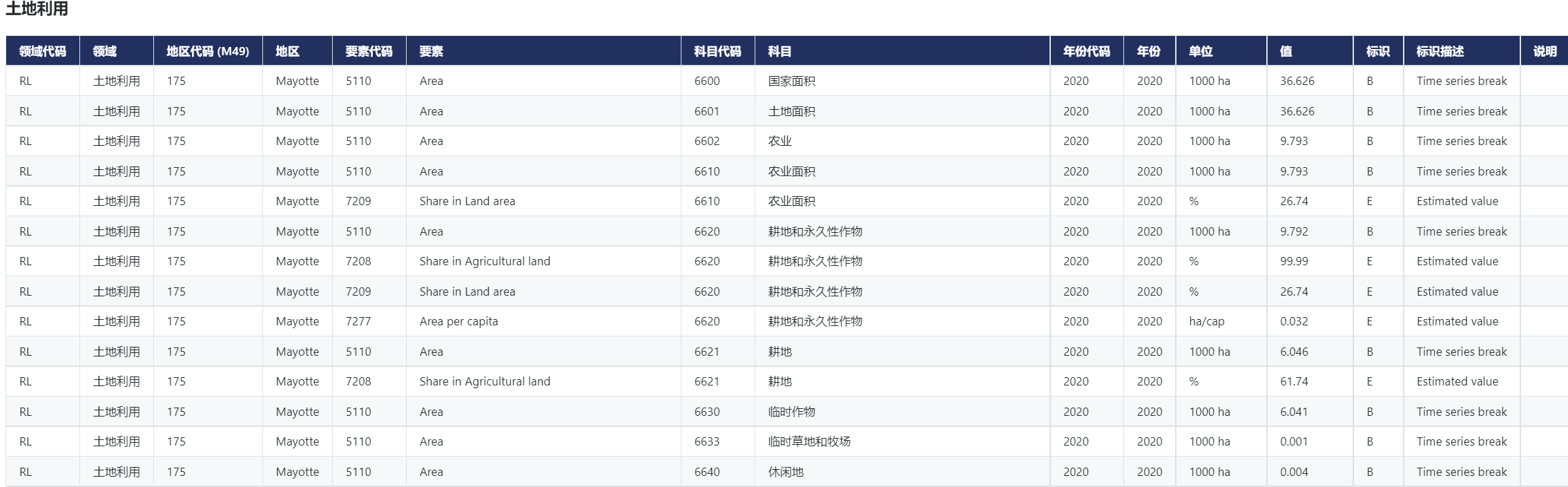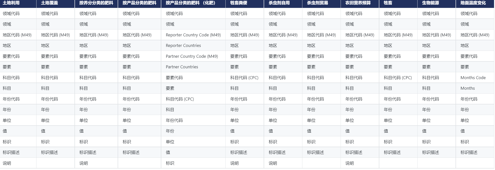 全球土地与农资数据收录了全世界200多个国家的土地和农用物资信息,分为土地利用、土地覆盖、按养分分类的肥料、按产品分类的肥料、按产品分类的肥料 (化肥)、牲畜粪便、杀虫剂自用、杀虫剂贸易、农田营养预算、牲畜、生物能源、地面温度变化等12张表,涵盖领域、地区、要素、科目、年份、单位、值、标识、说明等字段。