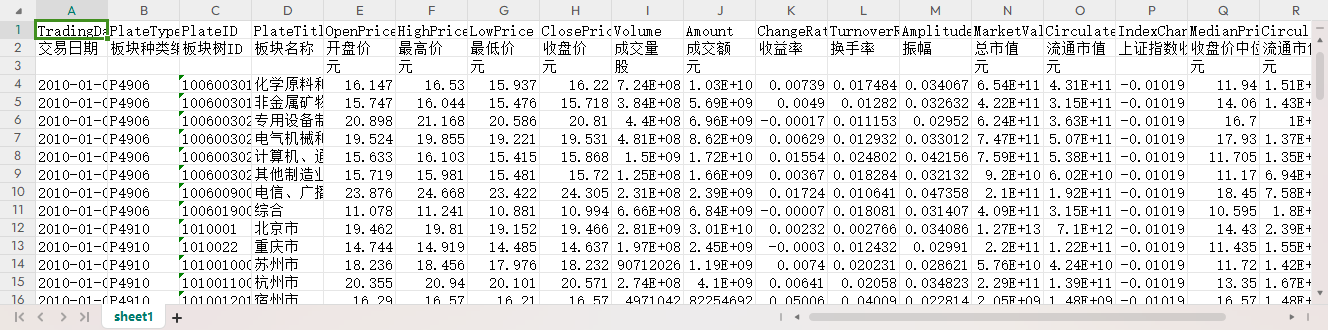 交易日期 板块种类编码 板块树ID 板块名称 开盘价 最高价 最低价 收盘价 成交量 成交额 收益率 换手率 振幅 总市值 流通市值 上证指数收益率 收盘价中位数 流通市值Q1 流通市值Q3