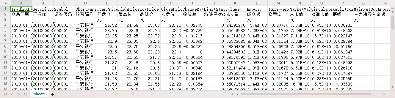 交易日期 证券ID 证券代码 股票简称 开盘价 最高价 最低价 收盘价 收益率 涨跌停状态 成交量 成交额 换手率 总市值 流通市值 振幅 主力净买入金额