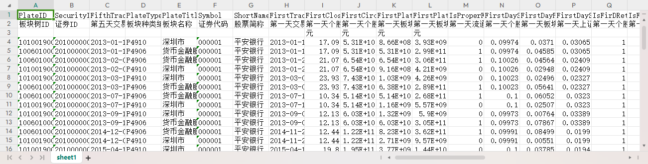 板块树ID 证券ID 第五天交易日期 板块种类编码 板块名称 证券代码 股票简称 第一天交易日期 第一天个股收盘价 第一天个股流通市值 第一天板块流通市值Q1 第一天板块流通市值Q3 第一天流通市值是否适中 第一天个股日收益 第一天板块日收益 第一天上证日收益 第一天个股日收益是否大于板块 第一天板块日收益是否大于上证指数 第二天交易日期 第二天个股日收益 第二天板块日收益 第二天上证日收益 第二天个股日收益是否大于板块 第二天板块日收益是否大于上证指数 第三天交易日期 第三天个股日收益 第三天板块日收益 第三天上证日收益 第三天个股日收益是否大于板块 第三天板块日收益是否大于上证指数 第四天交易日期 第四天个股日收益 第四天板块日收益 第四天上证日收益 第四天个股日收益是否大于板块 第四天板块日收益是否大于上证指数 第五天个股收盘价 第五天个股日收益 第五天板块日收益 第五天上证日收益 第五天个股日收益是否大于板块 第五天板块日收益是否大于上证指数 五天总体驱势是否向上
