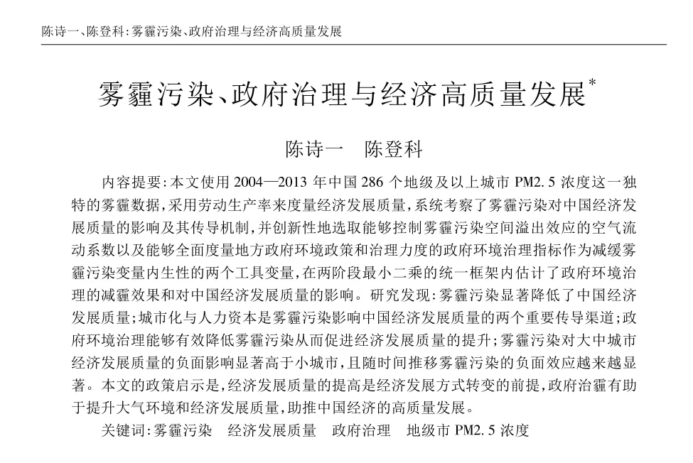 参考文献:[1]陈诗一,陈登科.雾霾污染、政府治理与经济高质量发展[J].经济研究,2018,53(02):