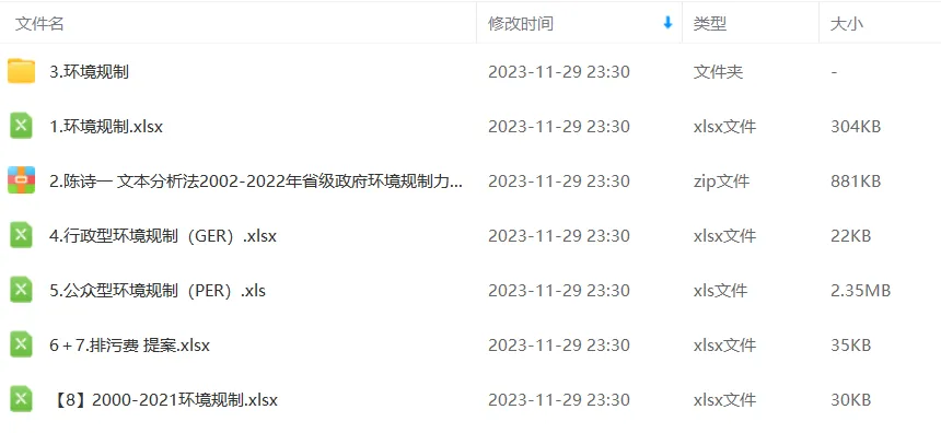 数据名称:环境规制强度 数据范围:全国300多个城市 数据年份:2002-2023年 数据来源:政府工作报告地区环境规制强度:基于各地区ZF工作报告中与“环境保护”相关词汇的频率,构建地级市ZF环境规制执行强度。各级ZF在每年年初“两会”召开期间向大会报告过去一年的工作成绩及未来的工作计划,报告在形成过程中凝聚了社会多方诉求和共识,对ZF当年工作起着决定性的指引作用。因此,ZF工作报告中对环境的重视程度能反映ZF当年环境治理力度以及治理政策的全貌。其中词汇为公布的15个:环境词汇、低碳、环境保护、空气、绿色、PM2.5、化学需氧量、二氧化碳、PM10、生态、排污、减排、污染、环保、二氧化硫、能耗等