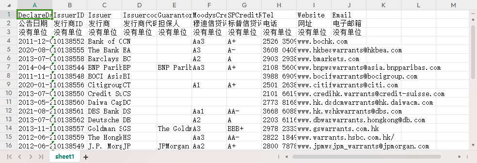 公告日期 发行商ID 发行商 发行商代码 担保人 穆迪信贷评级 标普信贷评级 电话 网址 电子邮箱