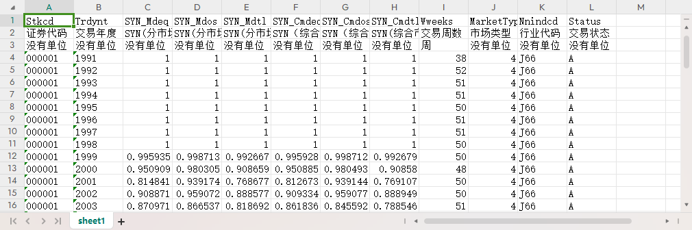 证券代码 交易年度 SYN(分市场等权平均法) SYN(分市场流通市值平均法) SYN(分市场总市值平均法) SYN(综合市场等权平均法) SYN(综合市场流通市值平均法) SYN(综合市场总市值平均法) 交易周数 市场类型 行业代码 交易状态
