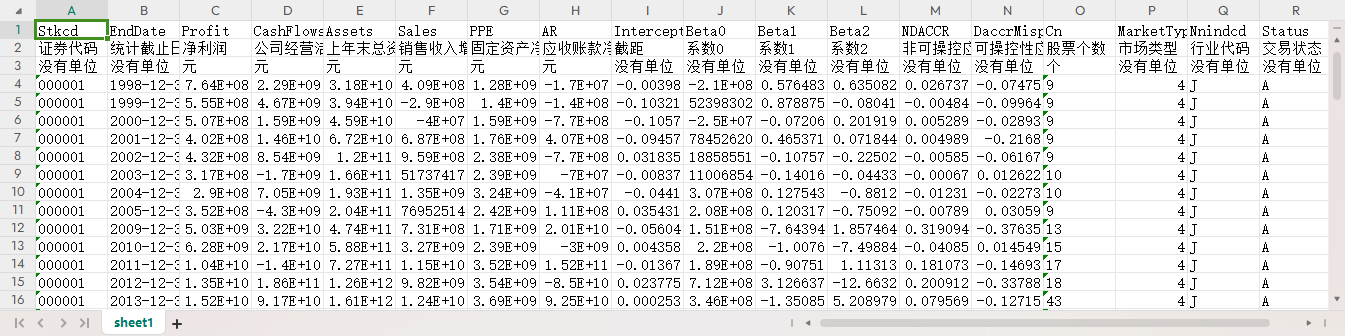 证券代码 统计截止日期 净利润 公司经营活动产生的现金流量净额 上年末总资产 销售收入增加额 固定资产净值 应收账款净值增加额 截距 系数0 系数1 系数2 非可操控应计利润 可操控性应计利润(错误定价) 股票个数 市场类型 行业代码 交易状态