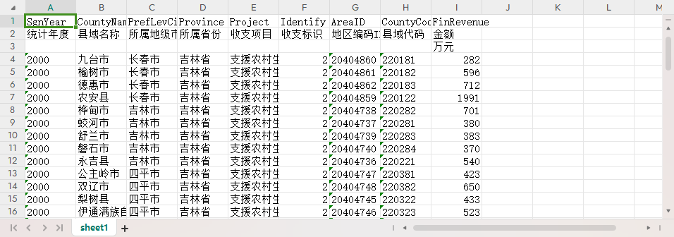 统计年度 县域名称 所属地级市 所属省份 收支项目 收支标识 地区编码ID 县域代码 金额