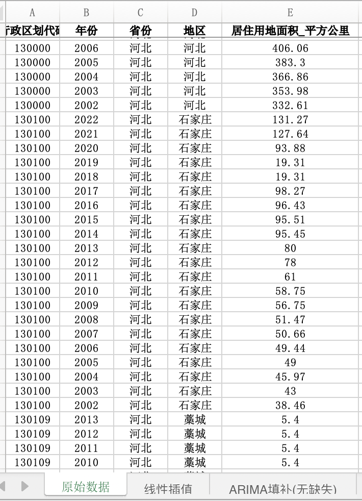 数据格式:Excel数据文件包含原始数据(由于多年度指标不同存在缺失值)、线性插值、ARIMA填补(无缺失)三个版本,提供您参考使用。其中,ARIMA填补无缺失值。
