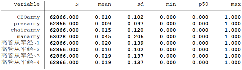 参考权威文献,以“董监高个人特征文件”中个人简历中包括“服役、参军、转业、军队、入伍、退伍、陆军、海军、退役、战士、战役、部队、解放军、军校、军区、连长、排长”等词汇作为判定是否有从军经历。此外,剔除了“董监高个人特征文件”中明显不符合从军经历的词汇,如姓名中包含“军”“兵”“警”,个人简历中包含“标兵”、“领军人才”等词汇,从而获得高管从军经历的测度指标