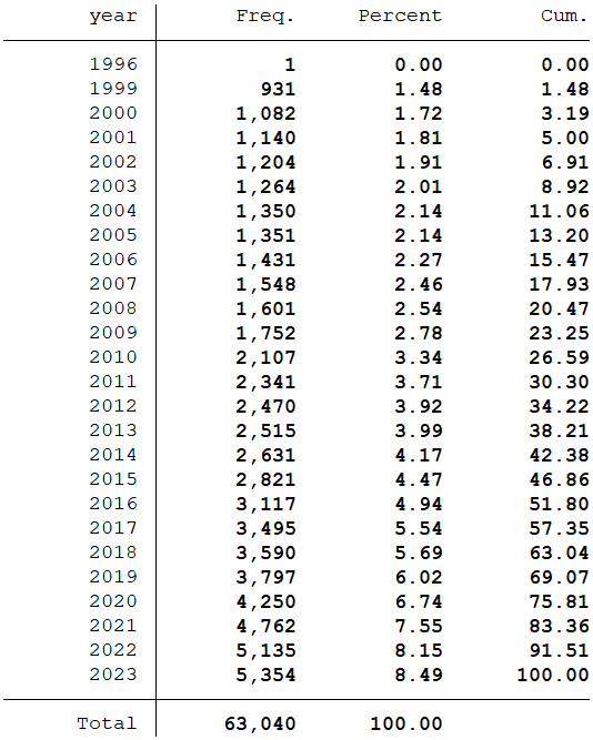 样本选择:全部A股1996-2023年数据(初始数据是从1990年12月10日开始,处理后的数据是从1996年开始)