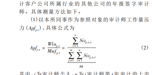 Apf数值越大表示j审计师比本所同事负载的超额工作量越大,工作量压力越大。此外,鉴于中国上市公司年报通常由两位审计师签字,本研究主测试部分采用两位签字审计师的工作量压力的均值作为i公司第t年的签字审计师工作量压力的数据。